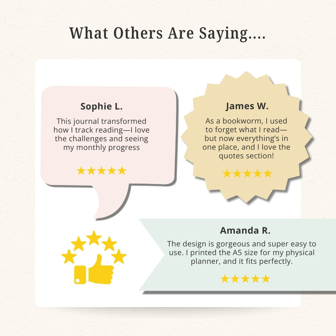 Rediscover the joy of reading with this beautifully designed journal that helps you stay organized, set goals, and reflect on every book you read. Whether you're a casual reader or a bookworm, this bundle brings your reading life to a whole new level—one thoughtful page at a time.