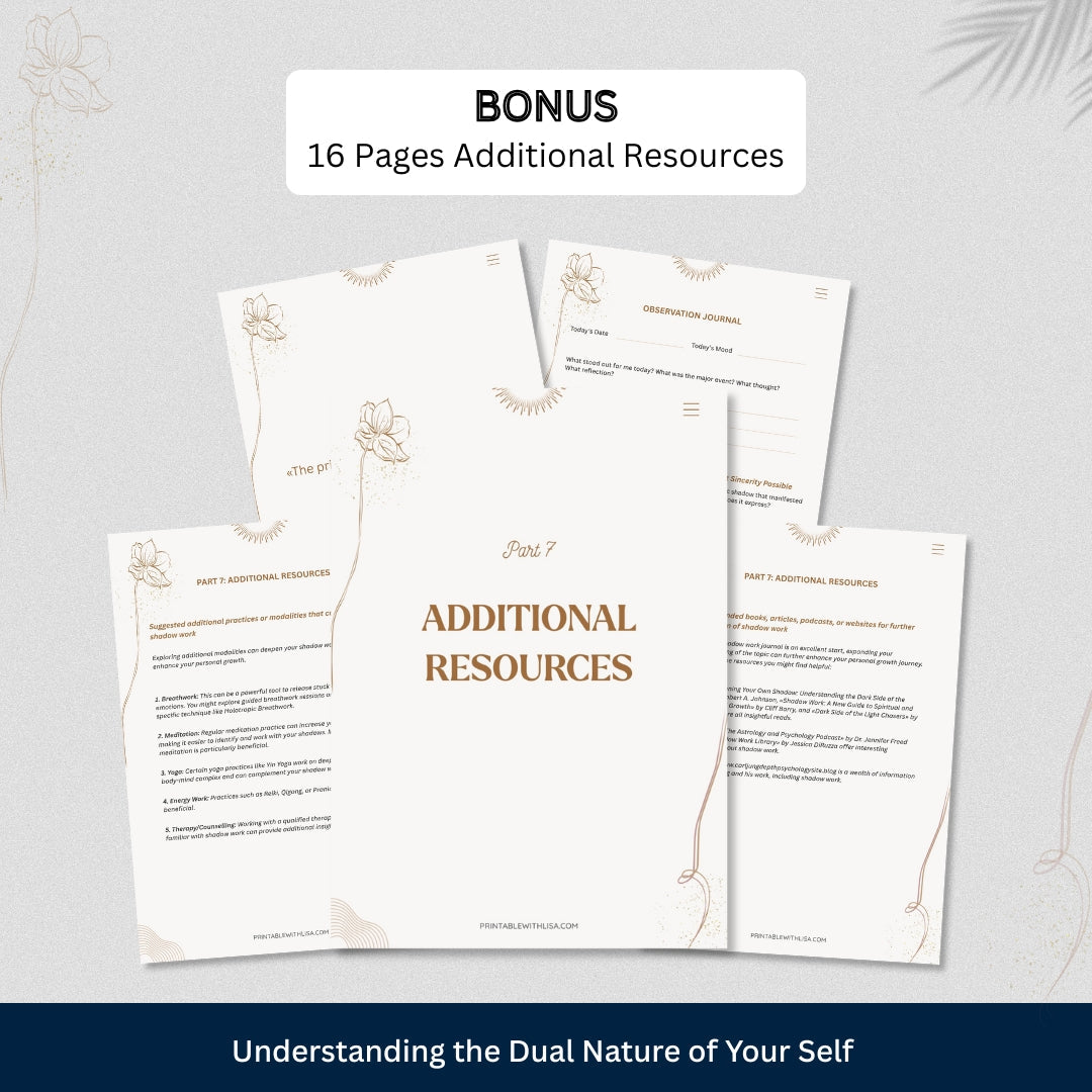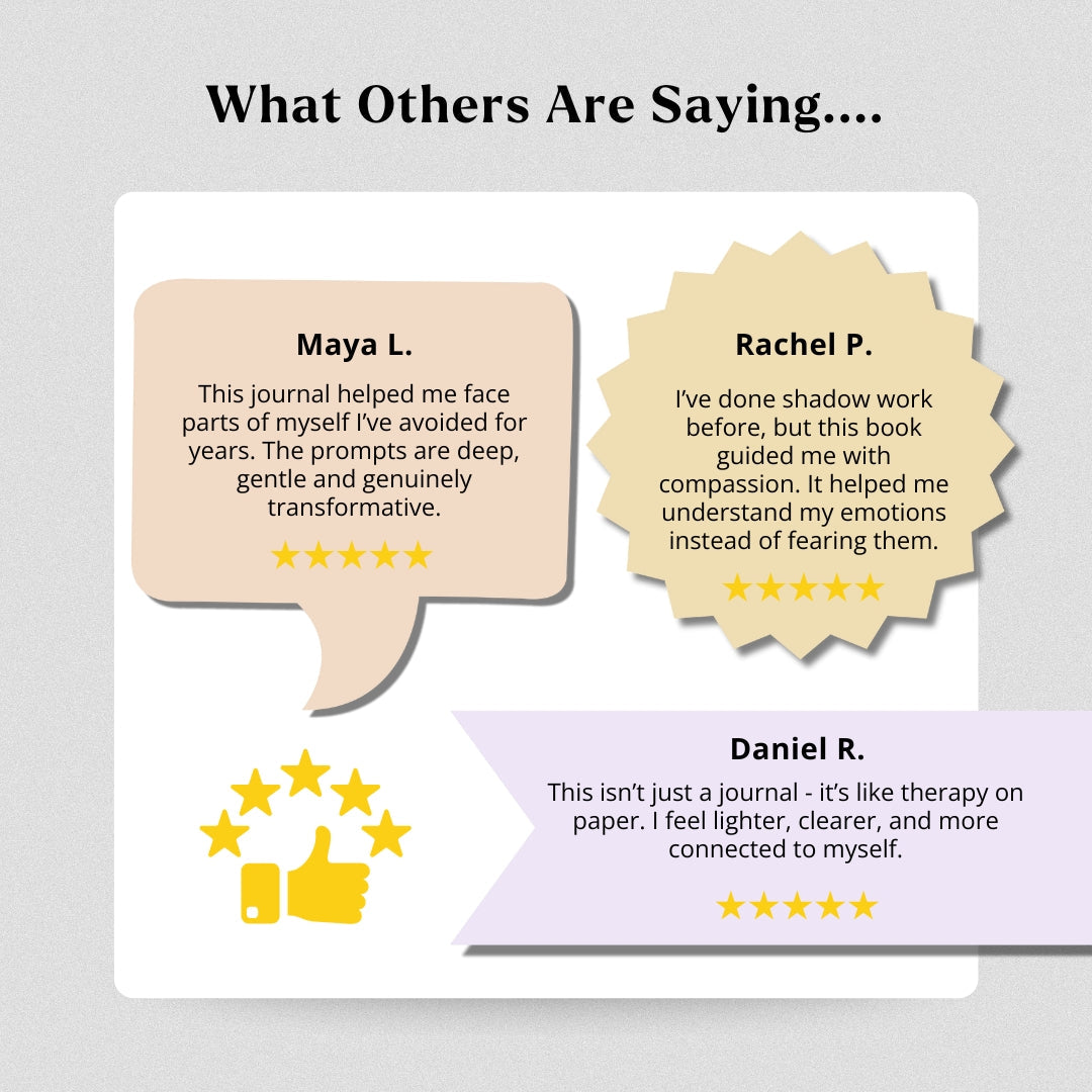 This 270+ page Inner Healing Shadow Work Journal is a gentle companion for the parts of you that feel hidden, rejected, or βtoo much.β Move through a structured, Jung-inspired process to explore your shadows, heal old emotional wounds, and reclaim your power with compassion. With guided prompts, reflections, and integration practices, youβll slowly turn self-judgment into self-acceptance and inner clarity.